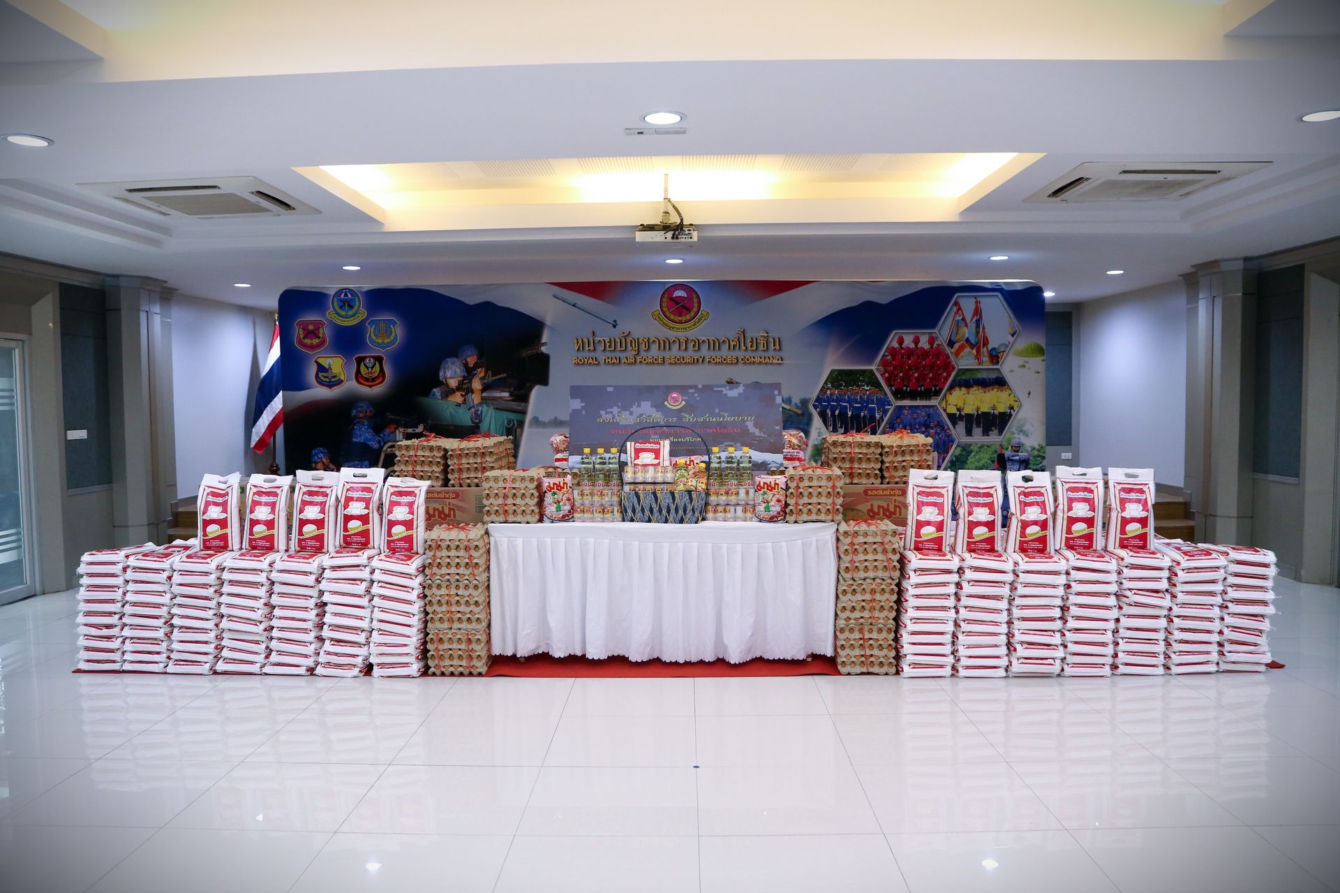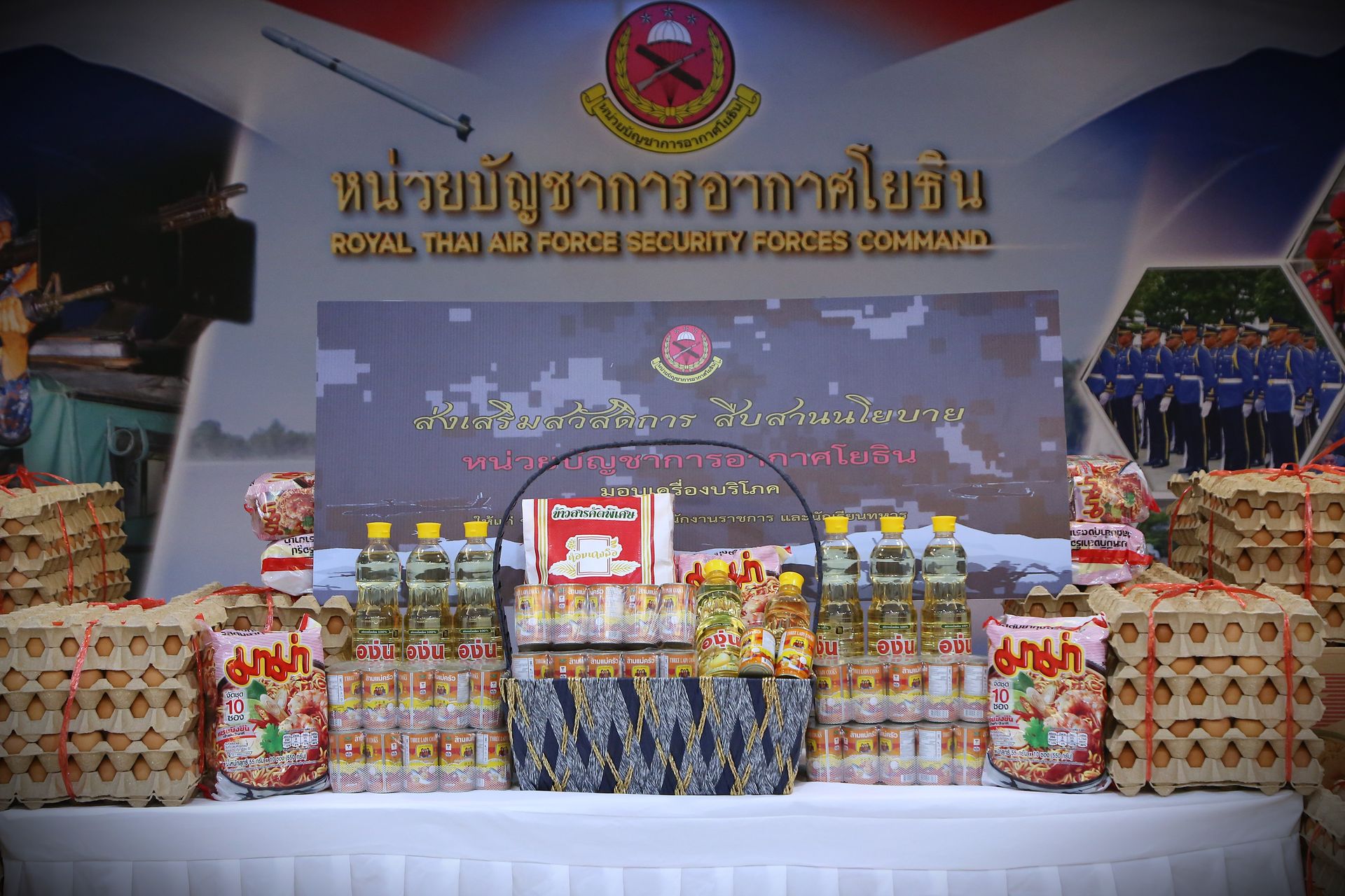 ในการนี้จะได้รับเครื่องบริโภค คนละ ๕ รายการ ประกอบด้วย ข้าวสาร ๕ กก., น้ำมันพืช ๑ ขวด, บะหมี่กึ่งสำเร็จรูป ๑๐ ห่อ ๑ แพ็ค, ปลากระป๋อง ๔ กระป๋อง และไข่ไก่ ๑๐ ฟอง
